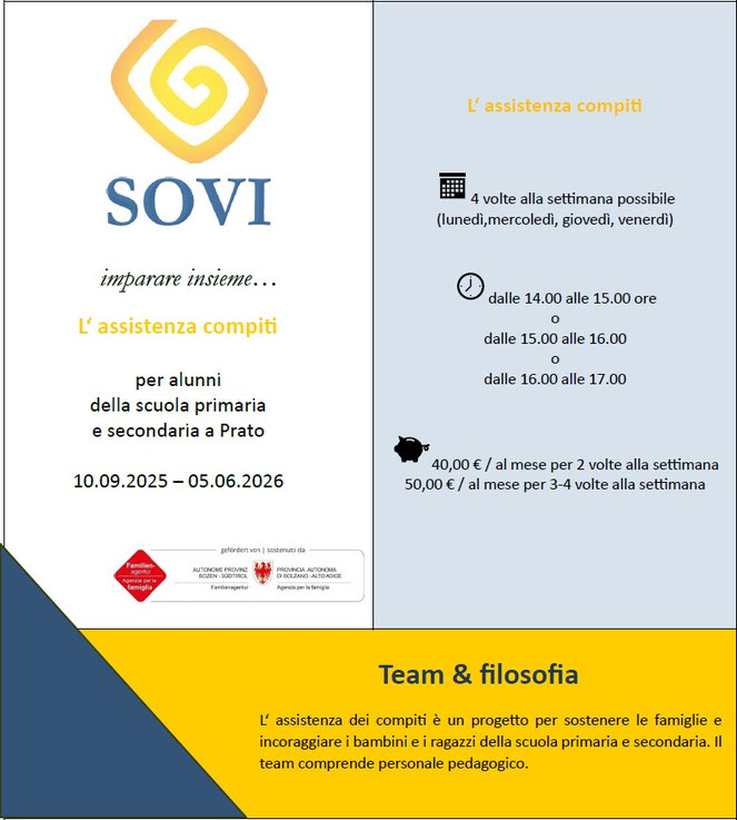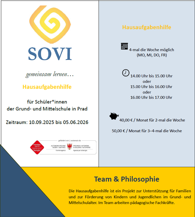 SOVI - Hausaufgabenbetreuung ist ein Projekt zur Unterstützung für Familien und zur Förderung von Kindern und Jugendlichen im Grund - und Mittelschulalter. Die Kinder verbringen das gesamte Schuljahr in einer konstanten Gruppe und können so auch ihre sozialen Kompetenzen und Freundschaften ausbauen.